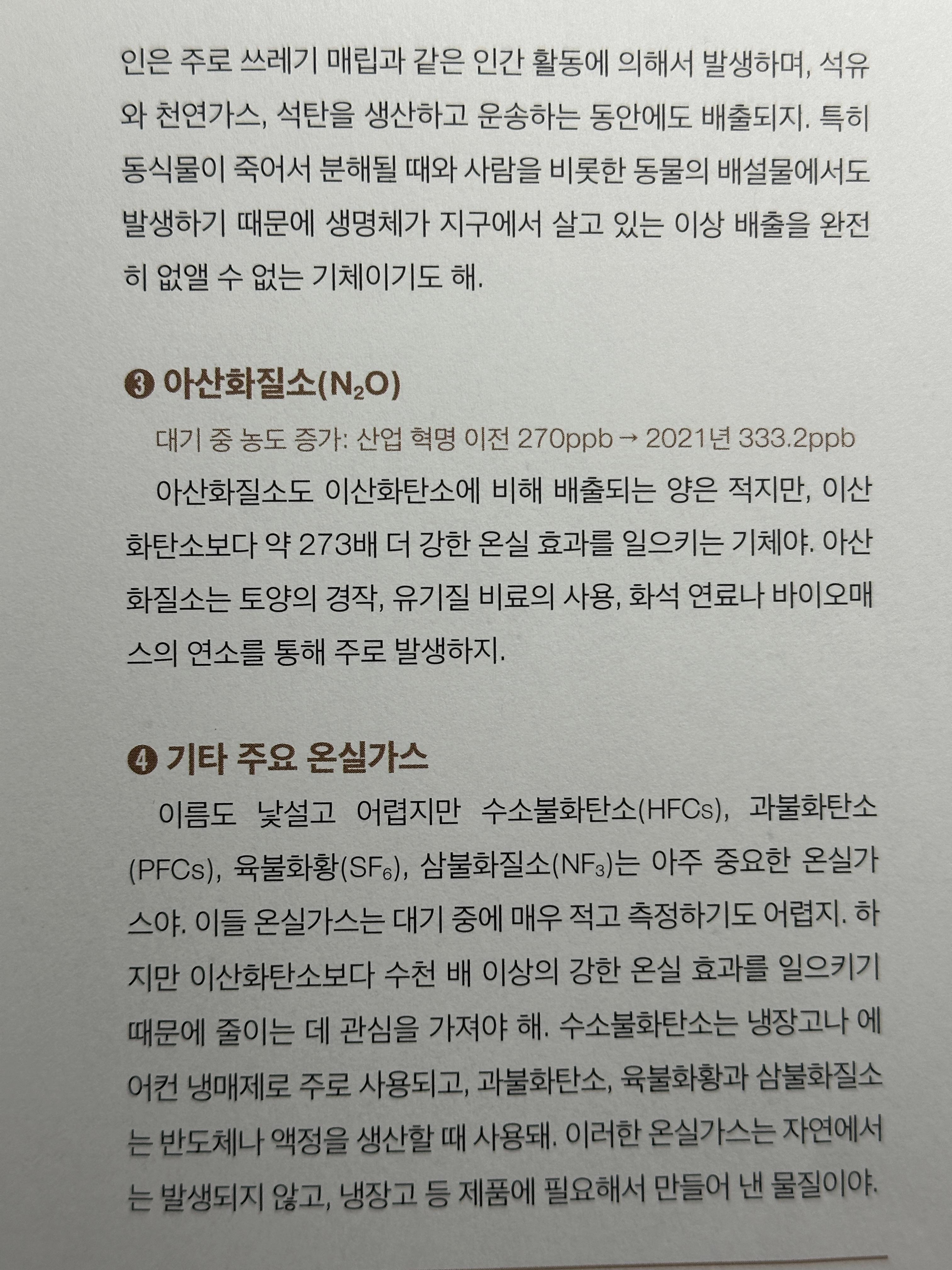- 대기-atmosphere-지구의 담요. 생명체들이 살아갈 수 있는 적당한 온도와 공기를 안전하게 유지. 온실가스 자체는 나쁜것이 아니다. 생명체가 살아가기 적당한 온도로 유지하기 위해 꼭 필요하지만 과한 것이 문제이다. 온실효과를 심화 시키는 대표적인 기체: 메탄Methane, 아산화 질소Nitrous oxide, 수소불화탄소hydrogenated carbon, 과불화탄소Perflurocarbon, 육불화황Sulfur hexafluoride, 삼불화질소Nitron Fluorine Three